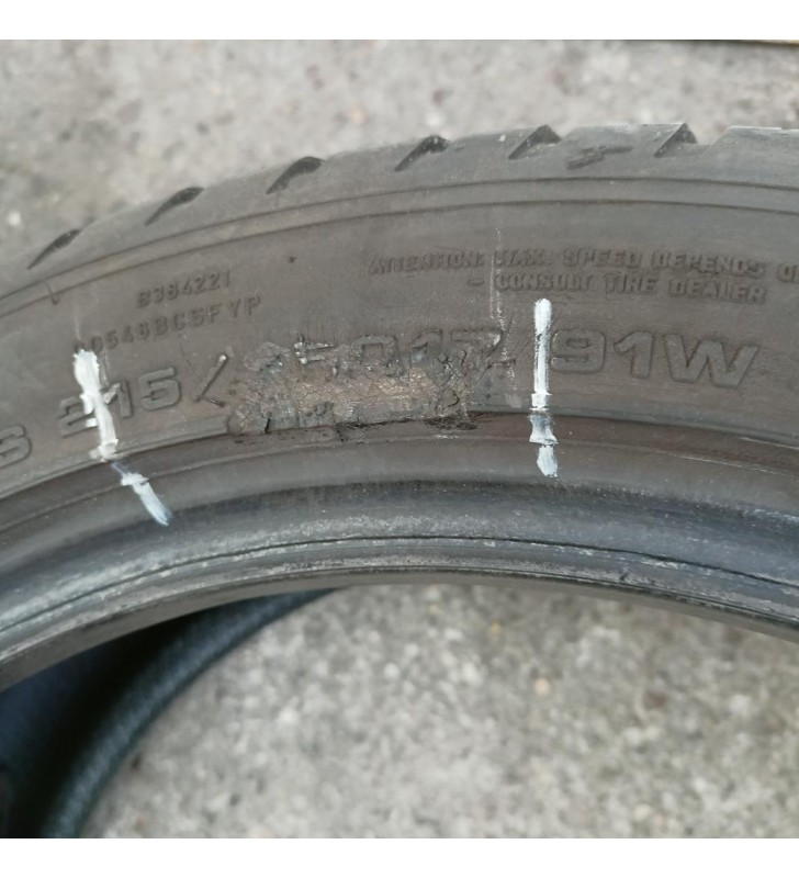 Witam, mam do zaoferowania oponę w rozmiarze 215/45/17 91W całoroczna firmy Goodyear Vector 4Seasons Gen-3, wysokość bieżnika 6mm, data produkcji 36 tydzień 2020, sprawdzona ciśnieniowo, powierzchowne zadarcia widoczne na zdjęciach. Cena dotyczy 1 sztuki.